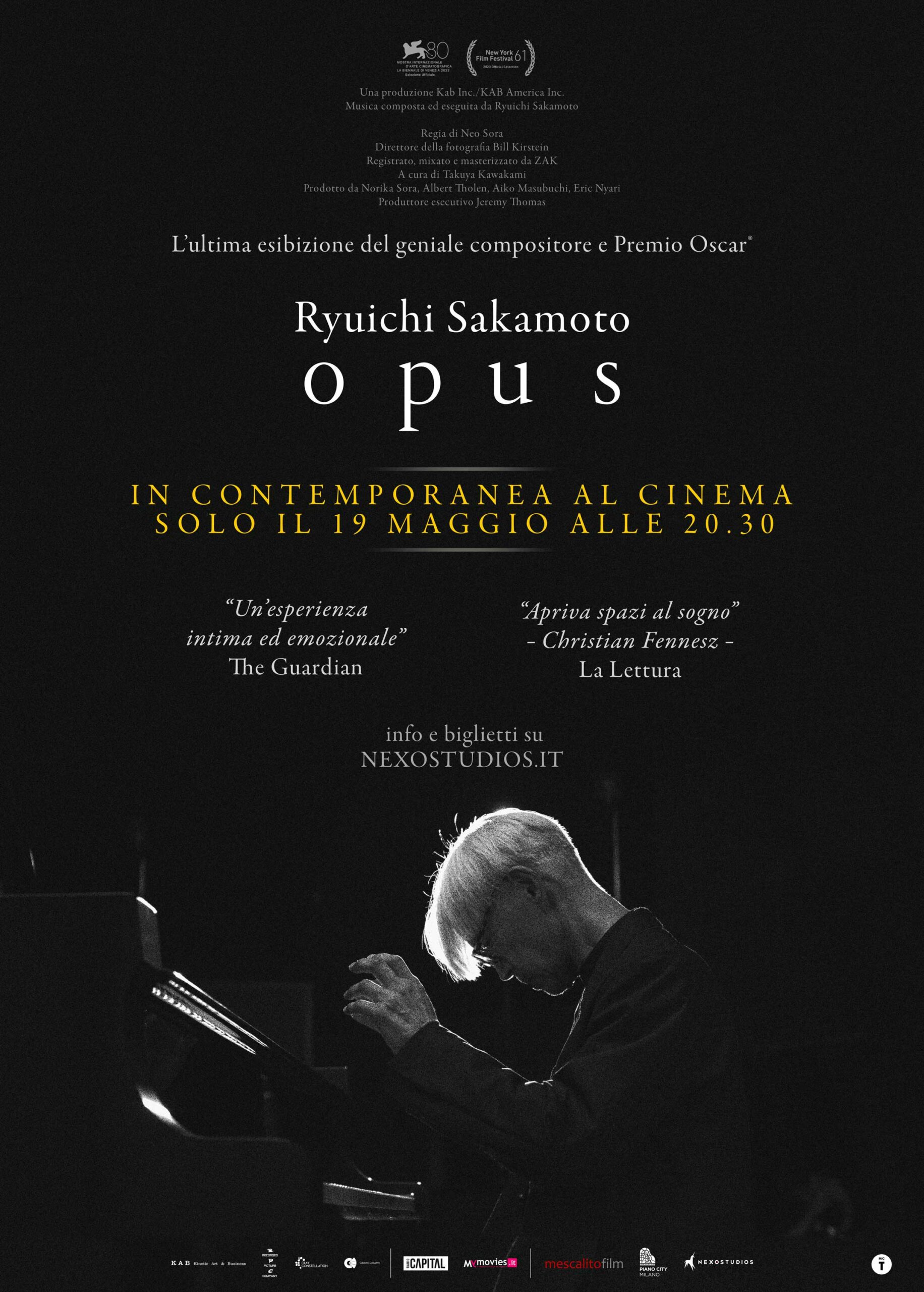 Trama: L?ultimo regalo di Sakamoto al suo pubblico. Il film-testamento diretto dal figlio Neo Sora che celebra la vita e il lavoro del leggendario compositore. Il film-testamento diretto da Neo Sora, figlio di Sakamoto. Presentato in anteprima all?80. Mostra Internazionale d?Arte Cinematografica di Venezia e all?edizione 2024 di Piano City Milano, Ryuichi Sakamoto | Opus racconta l?ultimo concerto del Maestro e rappresenta una celebrazione della vita e del lavoro del leggendario compositore: l?ultimo regalo che Sakamoto, che si è spento il 28 marzo del 2023, ha voluto preparare per il suo pubblico. Negli ultimi anni, Sakamoto non era piu? in grado di esibirsi dal vivo. I concerti e i tour erano troppo faticosi. Ciononostante, alla fine del 2022, Sakamoto ha raccolto le forze per lasciare al mondo un?ultima performance: un film concerto i cui protagonisti erano solo lui e il pianoforte. Curati da Sakamoto stesso e presentati nell?ordine da lui deciso, i venti pezzi eseguiti nel film narrano la sua vita in musica senza ricorrere alle parole. La scelta copre tutta la sua carriera, dal periodo da popstar con la Yellow Magic Orchestra alle magnifiche colonne sonore dei film di Bertolucci, alla musica del suo ultimo album contemplativo 12. Girato in uno spazio intimo che conosceva bene, circondato dai suoi piu? fidati collaboratori, Sakamoto ha messo a nudo la propria anima attraverso la musica, sapendo che sarebbe stata forse l?ultima occasione di presentare la propria arte. Celebrazione della vita di un artista nel senso piu? puro del termine, Ryuichi Sakamoto | Opus e? il canto del cigno dell?amato maestro. Sakamoto aveva spiegato così il senso del progetto: ?Dall?8 al 15 settembre 2022 mi sono dedicato a qualcosa di molto importante per me: filmare Ryuichi Sakamoto | Opus. Il progetto è stato concepito come l?occasione per registrare una mia performance ? quando ancora ero in grado di esibirmi ? che valesse la pena preservare per il futuro. Abbiamo preso in prestito lo Studio 509 dell?NHK Broadcast Center per registrare: un luogo che penso offra la migliore acustica possibile in Giappone. Il regista, Neo Sora, era piuttosto severo. Ha insistito perché decidessi con largo anticipo l?intero repertorio dei 20 brani che avrei suonato, in modo da preparare meticolosamente le riprese. Ho suonato a casa ogni pezzo che abbiamo poi registrato su un iPhone, per costruire la composizione dell?intero concerto che vuole idealmente rappresentare il tempo che trascorre dalla mattina alla sera. Tutto è stato meticolosamente realizzato con uno storyboard, in modo che la posizione delle camere e l?illuminazione cambiassero con ogni brano. A capo di una troupe di quasi trenta persone c?era il direttore della fotografia Bill Kirstein, che ha girato il film utilizzando tre camere 4K. Dal canto mio, quando ho iniziato le riprese ero un po? nervoso al pensiero che questa potesse essere l?ultima possibilità di condividere una mia performance. Abbiamo registrato alcuni pezzi al giorno, con molta cura. Ho suonato alcuni brani che non avevo mai suonato al pianoforte solo, come ?The Wuthering Heights? (1992) e ?Ichimei ? piccola felicità? (2011). Ho suonato ?Tong Poo? in un nuovo arrangiamento a un ritmo più lento di quanto l?avessi mai eseguito. Quindi, in un certo senso, mentre pensavo a questa come la mia ultima opportunità di esibirmi, sentivo anche di essere in grado di aprirmi a nuovi orizzonti. Suonare semplicemente qualche brano al giorno con molta concentrazione era tutto ciò che potevo fare a questo punto della mia vita. Forse a causa di questo sforzo, in seguito mi sono sentito completamente vuoto e le mie condizioni sono peggiorate per circa un mese. Ma, nonostante questo, mi sento sollevato di aver potuto registrare prima della mia morte una performance di cui ero soddisfatto?. Il regista e figlio dell?artista Neo Sora ha aggiunto: ?Sakamoto diceva che il piano era il prolungamento delle sue mani e in Opus ho voluto mostrare l?intreccio tra esecutore e strumento e come il respiro di Sakamoto si mescolava allo scricchiolio e al sibilo dei meccanismi del pianoforte. Il dialogo tra i due organismi estraeva le rispettive corporeita?. Il film, memore della fascinazione di Sakamoto per il tempo, e? progettato in modo da evocare visivamente il trascorrere delle ore nel corso di un?intera giornata. Mentre il tempo passa, la luce cambia, completando un cerchio, per poi ritornare alla posizione originale. Il film e? girato in bianco e nero: spero di aver catturato il modo in cui la vita di Ryuichi Sakamoto, densa di sperimentazione, curiosita? e innovazione, sia ritornata alle origini: al pianoforte?.